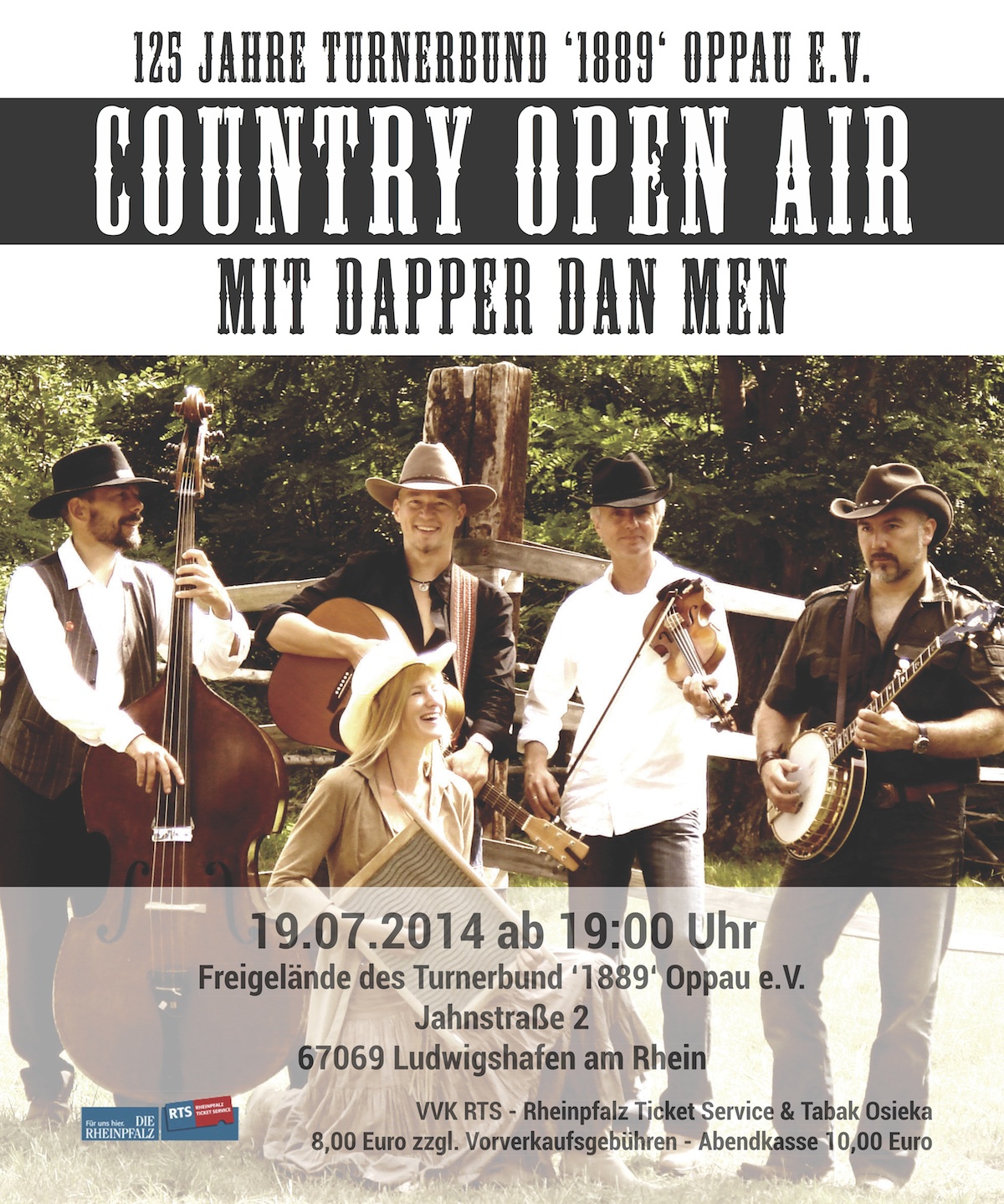 Am 19.07.2014 findet auf dem TBO Gelände (Jahnstr. 2 - 67069 Ludwigshafen) ein Country Open Air Konzert mit der Band Dapper Dan Men statt. Nähere Informationen entnehmen Sie bitte dem Plakat.