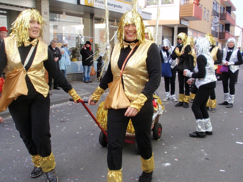 Zwei flotte schwarze Shirts/Blusen und goldene/silberne Leggings hatte ich im Internet sonntags herausgesucht und per Link an die einzelnen Akteure per Mail weitergeleitet. Sie sollten sich bis zur nächsten Stunde für eine Variante entscheiden. Nachdem alles ausgewählt war, waren im Versandkaufhaus die T-Shirts/ Blusen nicht mehr in alle Größen vorhanden. Schwarze Rollis tun es auch. Die Leggings waren noch verfügbar. Sie wurden zügig geliefert. Sie sahen gut aus – solange wir sie nicht an hatten. Vorteilhaft war was anderes. Also wieder alles zurück. Beim Durchsehen der Fastnachtsartikel im Internet, sind mir die goldenen und silbernen Perücken aufgefallen. Die passen bestimmt gut zu dem Allgemeinbild. Die wurden gleich bestellt.