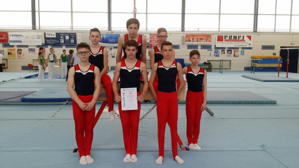 Am Freitag, den 21.04.2017, fuhren wir um 12:30 Uhr in zwei kleinen Bussen nach Halle zu unserem 1. Nachwuchsbundesliga Wettkampf dieses Jahr. Erstmals starteten wir als TG-Pfalz mit fast nur eigenen Turnern in dieses neue Wettkampfformat, das letztes Jahr ins Leben gerufen wurde. Damals noch in Kooperation mit Buttenwiesen und Würzburg mit nur drei Turnern aus unserem Verein, konnten wir jetzt 6 Turner stellen. Zur Unterstützung hatten wir einen Turner aus unserer Kooperation mit Gau-Odernheim und einen Turner aus Mannheim dabei. Nach einer langen Anreise und einem gemütlichen Abend wurde es am nächsten Tag ernst. 7 Mannschaften gingen an den Start, fast ausschließlich große Turnzentren, die den doppelten Trainingsaufwand betreiben wie wir. Als jüngste Mannschaft versuchten wir deshalb nur unser selbst gestecktes Ziel, 180 Punkte (pro Gerät 30 Punkte), zu erreichen. Die noch große Nervosität machte sich bemerkbar, denn am Reck und am Seitpferd konnten unsere Turner ihre Übungen nicht sicher durchturnen. Dies kostete uns einige Punkte. Dennoch waren wir mit dem Endergebnis von 178,75 Punkten sehr zufrieden. Immerhin war es im Vergleich zum letzten Jahr eine enorme Steigerung und das war für uns das Wichtigste.
